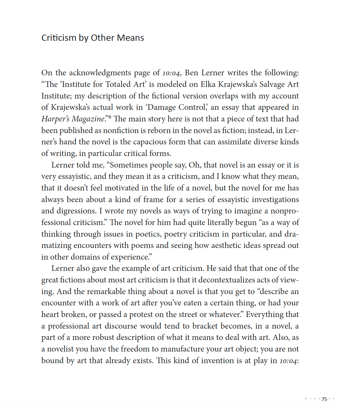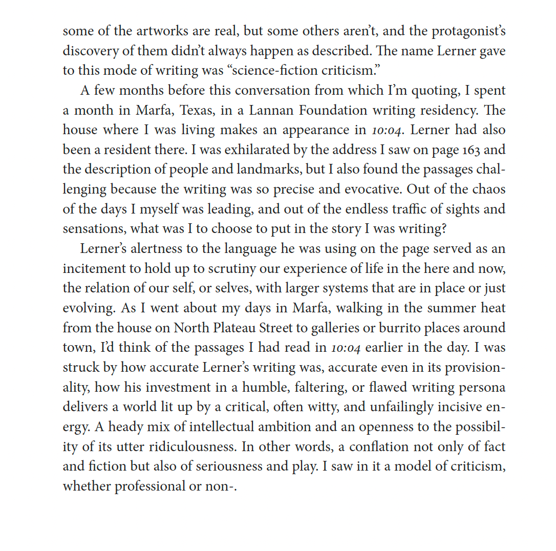 Often when people talk about novels, they speak of getting lost in another world. I don’t think this is the most accurate way of describing Lerner’s writing. Rather than finding entry into another world, what I find most affecting about this work, perhaps because Lerner appears to be reporting with such precision from this world that we all inhabit, is often like a jolt of recognition. I see my surroundings more clearly and grow aware of my thoughts and the processes through which my emotions take shape. This is the best way I can describe that loose term “autofiction.”