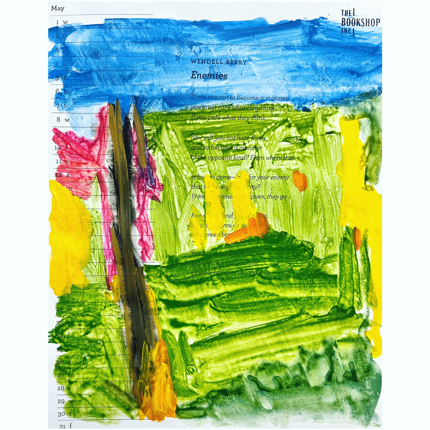 P.S. This painting was done on the May month-page of the calendar given to me by The Bookshop in Delhi. The poem printed on it is “Enemies” by Wendell Berry. The poem begins: