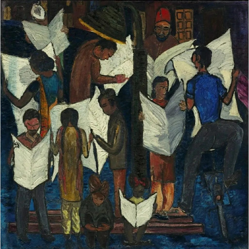 “I was in Delhi when Gandhiji was assassinated. As I walked home in the evening I saw a group of people huddled under a lamp post anxiously reading newspapers. The image followed me for a long time, till I painted it in 1948.”