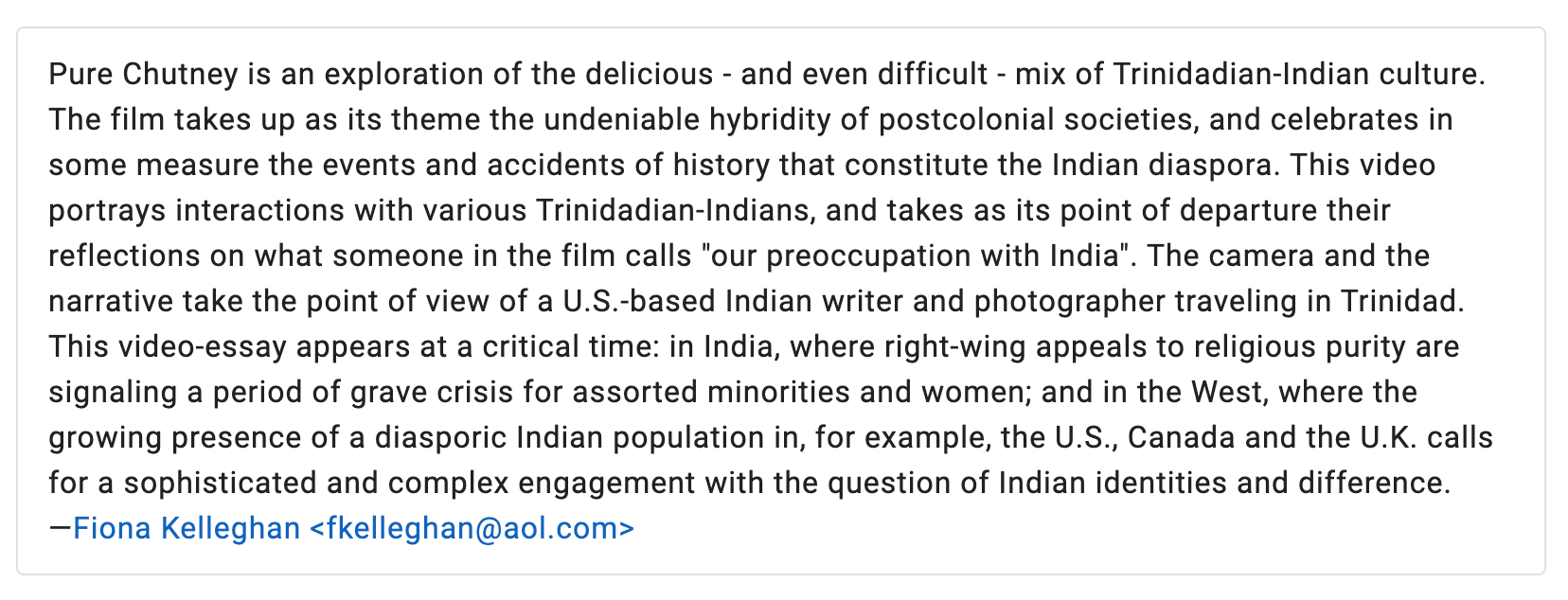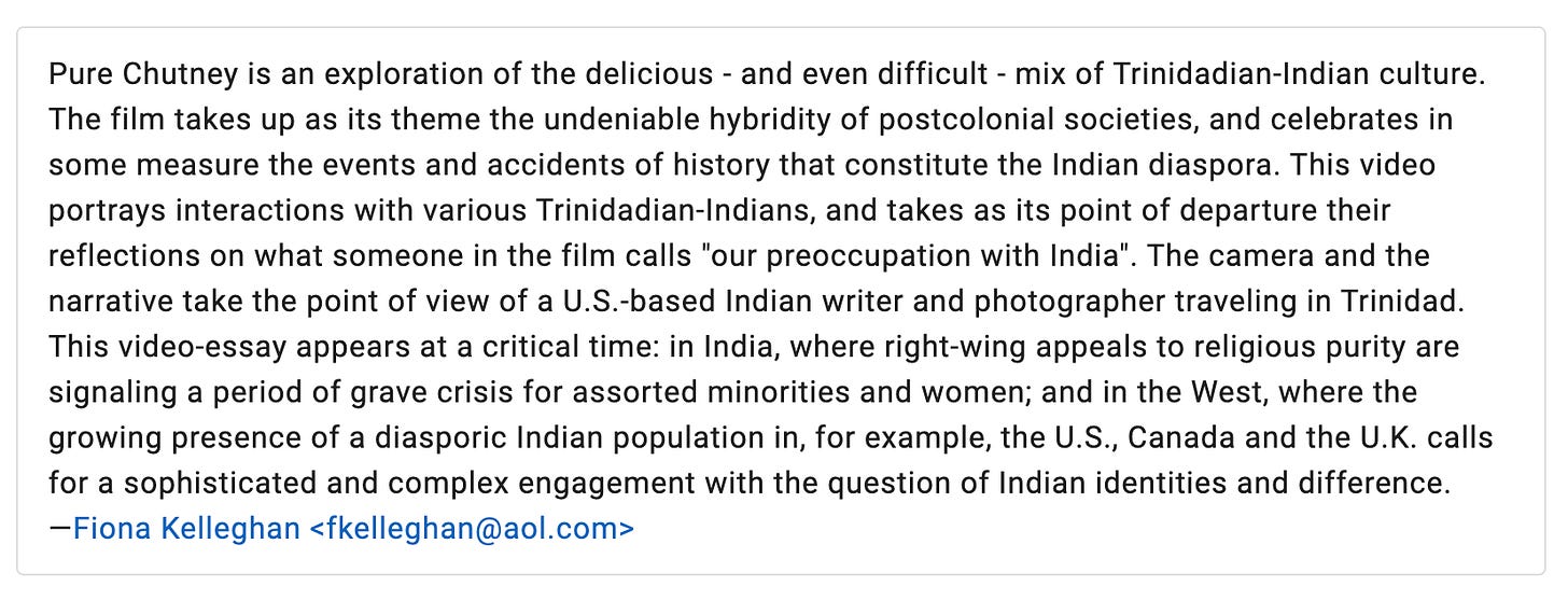Long before I had read Enigma, I had read Naipaul’s other books, not only his early fiction, but also his books on India. In the late nineteen nineties, I had gone to Trinidad with a desire to travel in the opposite direction from Naipaul. During his repeated trips to India, Naipaul was often searching for his roots; reversing his direction of travel, I was exploring routes, the different journeys in history that had taken Indians to other places in the world. My companion during those travels was my filmmaker friend, Sanjeev Chatterjee. The 42-minute documentary film we made together was “Pure Chutney.” We later made a film in South Africa and that was titled “Dirty Laundry.” Here is a description that I could find about “Pure Chutney” on the IMDB website: