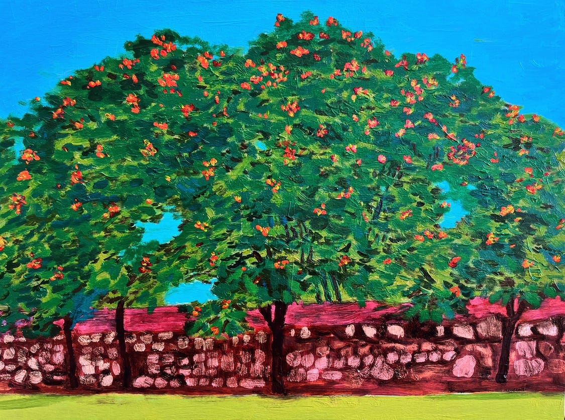 In an ideal world (oh, I know), your letters will move the editors to publish in their very next issue a detailed and gorgeous review of my last novel and, and, and, this is crucial, they will also use in the review one of my drawings as the illustration. Maybe this oil on a wood panel depicting a gulmohar in bloom in my native land. See below. (I’m pleased to announce that both the burdock leaf and the gulmohar will appear in the final volume of my trilogy of drawing books, The Green Book, about to be published by HarperCollins India later this year.)
