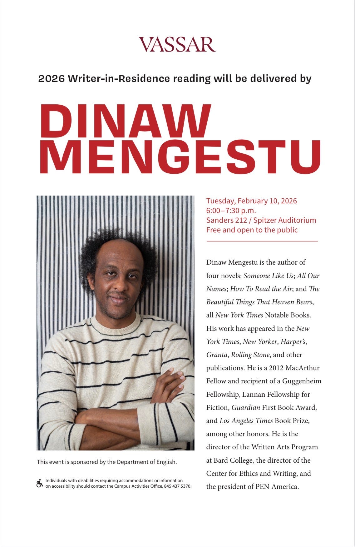 Vassar College’s 2026 writer-in-residence is Dinaw Mengestu, a prize-winning novelist, recipient of the MacArthur “Genius” Award, and the director of the Written Arts Program, as well as the director of the Center for Ethics and Writing, at nearby Bard College. Dinaw delivered his lecture earlier this week and then, two days later, he visited my class. We had just finished reading V.S. Naipaul’s A Bend in the River and Dinaw’s own short-story “The Paper Revolution.”