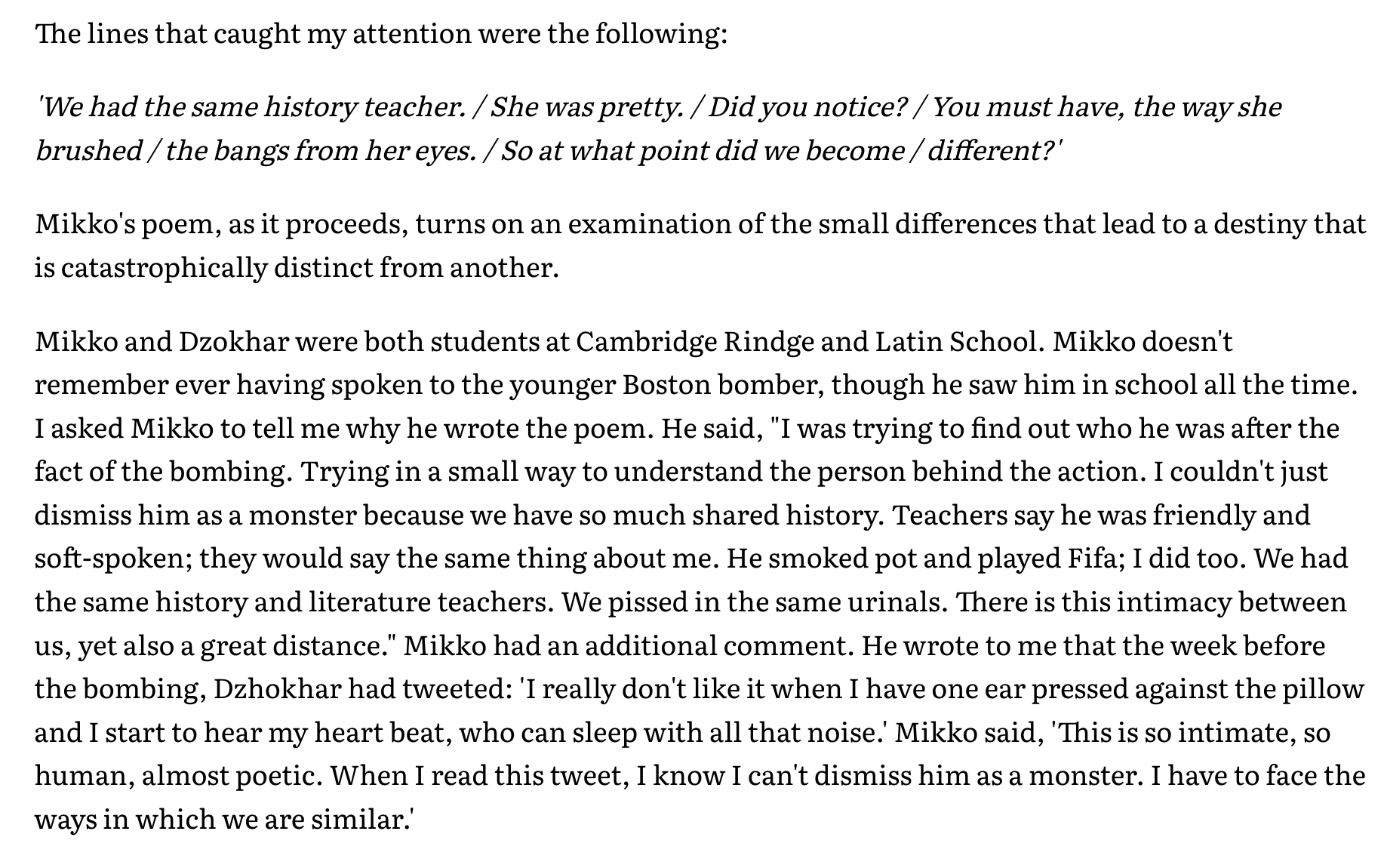 I asked Mikko the question about war because war is on my mind, I suppose, but also because of how I remember Mikko’s writing during his final year here at Vassar. I had written about him for Open Magazine and this piece was also included in my book Lunch With A Bigot published by Duke University Press. Mikko had written a poem in his senior thesis about a boy in his class when they were in high school in Cambridge; the poem’s title was “My Inability to Pronounce Your Name” and now I must reveal that the boy’s name was Dzokhar Tsarnaev, one of the two brothers involved in the Boston bombing. Here’s a relevant excerpt from my essay about Mikko’s writing:
