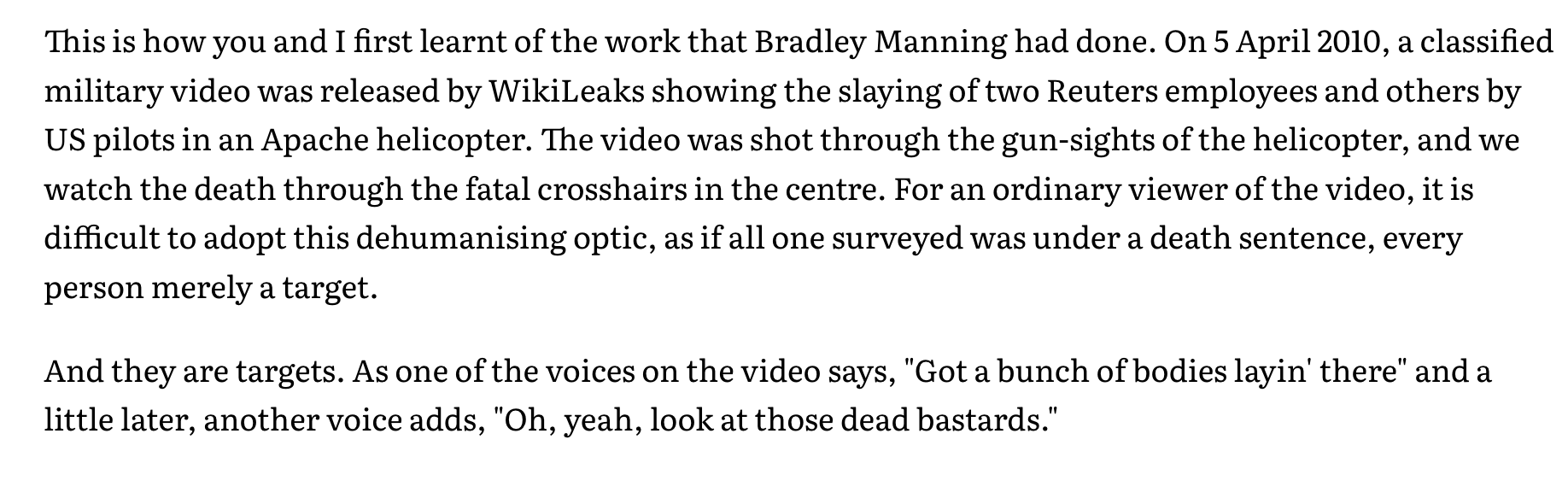 In the essay that I have quoted from above, I had mentioned that just as I was writing about Mikko’s poems, the news on the radio was about the trial of the brave person who was then called Bradley Manning. I was applauding Manning for showing us the reality of war—the Americans in their Apache helicopters delivering death from the sky.