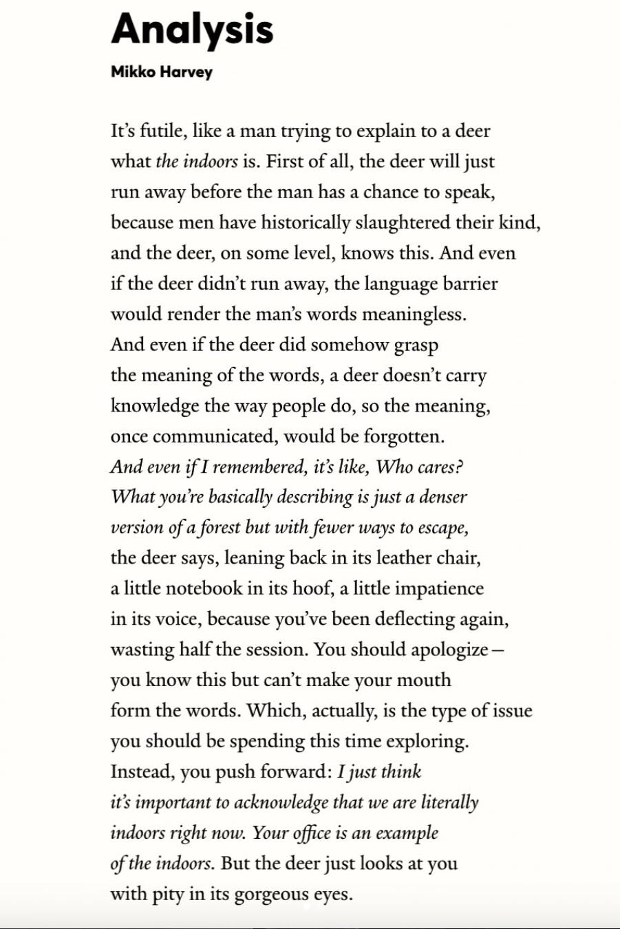 I love the turn midway through the poem, the deer is no longer the dumb animal but the suave and sophisticated analyst. There are other layers. The man or the “you” can’t make his mouth form the words—and that is the type of issue he should spend his time exploring. A profound, mischievous clue that the poet has dropped in the middle of the beautiful mystery that is this poem.